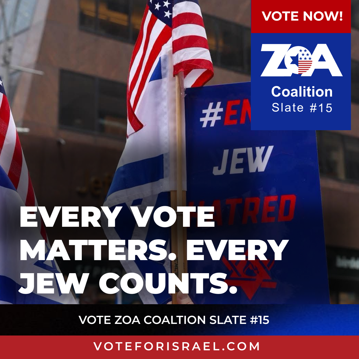 We can't afford to sit this one out. Vote for the ZOA Coalition—Slate #15—to ensure bold, pro-Israel leadership in this critical battle.