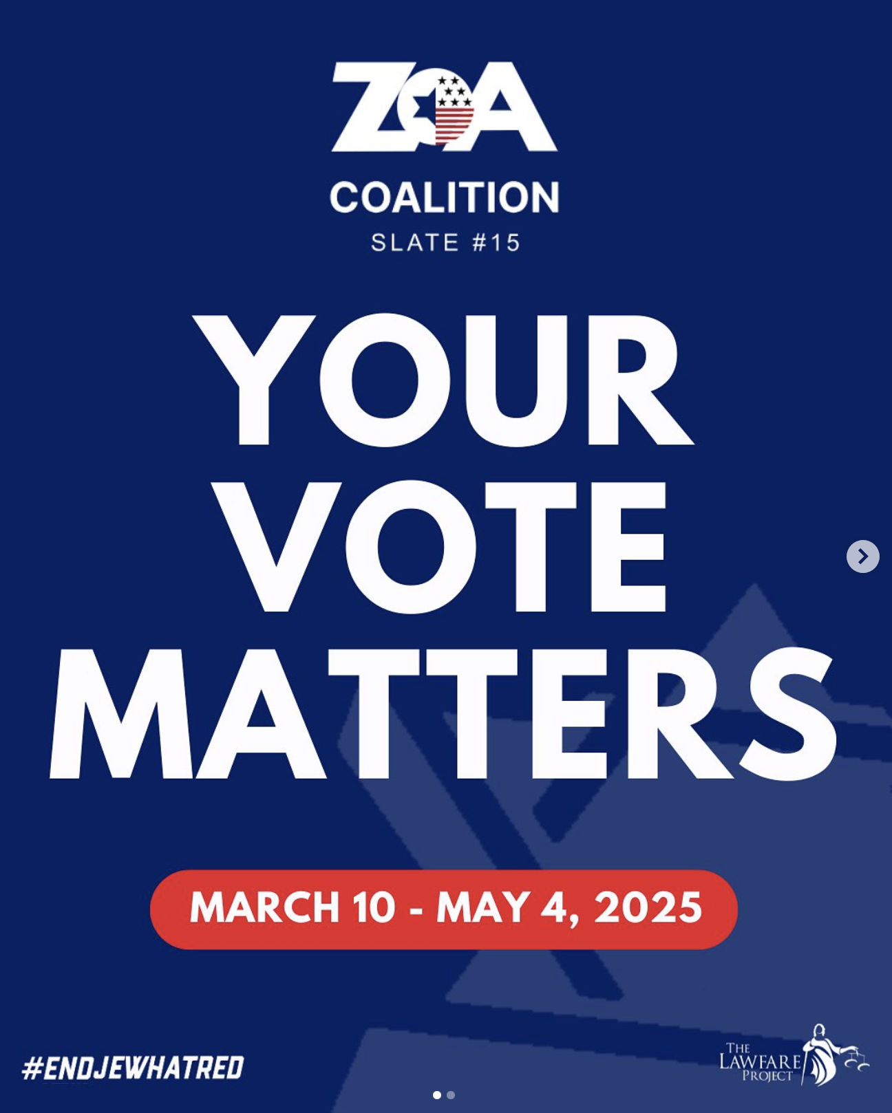 Cast your vote for the future of Israel and the Jewish people. Why others have voted – and why you should too: "I voted because Israel's security and our children's future are on the line. This election is crucial." – Miriam L. "The ZOA coalition is fighting for everything that matters to us. Voting for them is a no-brainer." – David R. "Our voice in these elections will shape the future of Jewish life. I voted for Slate #15 because it's the only way forward." – Rachel K. Don't let others decide for us. Your vote is your voice. Vote Now. Vote ZOA – Slate 15! Vote now!