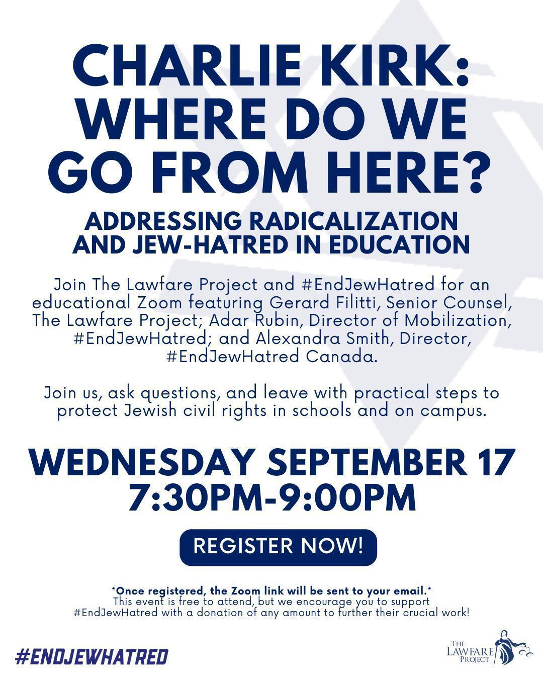 Charlie Kirk: Where do we go from here? Addressing radicalization and Jew-hatred in education September 17, 2025 / Webinar  Join us tonight for a timely webinar confronting the growing threats of radicalization and Jew-hatred in schools and on campuses. Hear from Gerard Filitti, Senior Counsel at The Lawfare Project; Adar Rubin, Director of Mobilization at #EndJewHatred; and Alexandra Smith, Director of #EndJewHatred Canada, as they share insights and practical steps to protect Jewish civil rights in education. Click here to register! This event is free to attend. We encourage you to support the #EndJewHatred movement with a donation of any amount to strengthen our essential work. Support the Movement! Your support powers this movement—every gift helps us fight Jew-hatred and defend Jewish civil rights.  The #EndJewHatred movement is an initiative of The Lawfare Project. The Lawfare Project is a qualified 501(c)(3) tax-exempt organization and a registered non-profit organization. Donations are deductible under section 170 of the Internal Revenue Code.