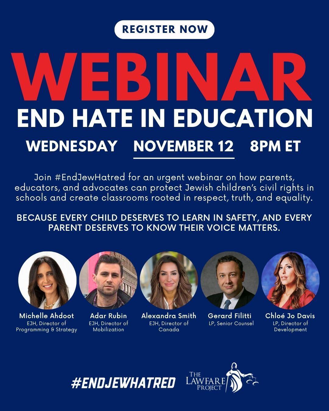 Join us for an important webinar on our End Hate in Education initiative, a campaign dedicated to stopping indoctrination and Jew-hatred in classrooms across the U.S. and Canada.
